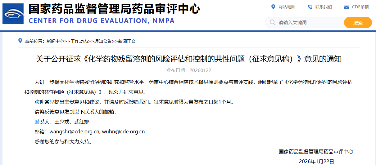 为进一步提高化学药物残留溶剂的研究和监管水平,药审中心结合相应技术指导原则要点与审评实践,组织起草了《化学药物残留溶剂的风险评估和控制的共性问题(征求意见稿)》,现公开征求意见。