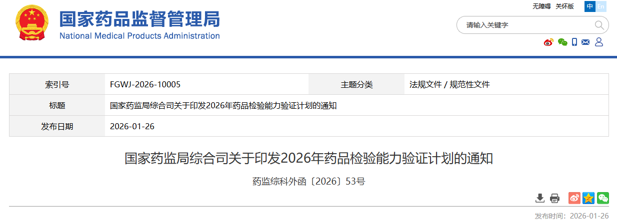 国家药监局综合司关于印发2026年药品检验能力验证计划的通知