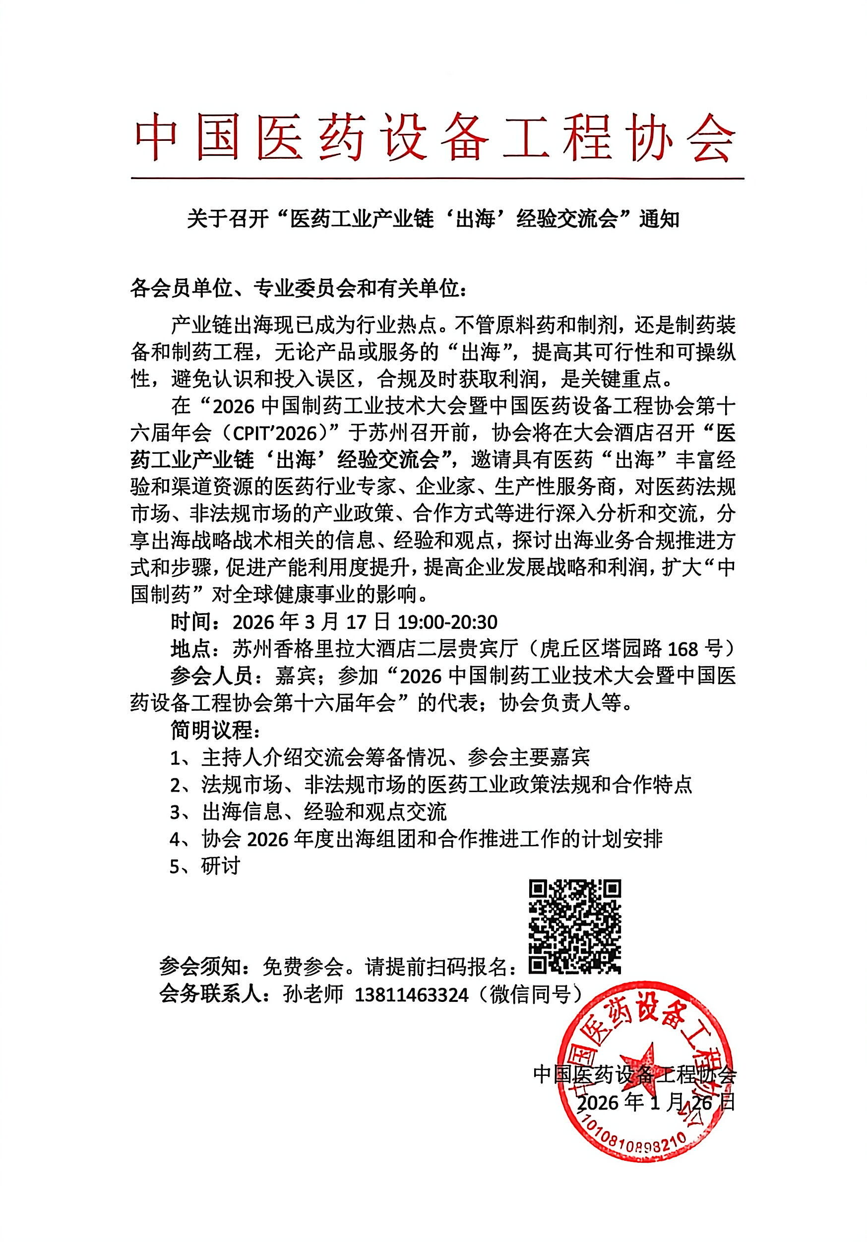 在“2026中国制药工业技术大会暨中国医药设备工程协会第十六届年会(CPIT’2026)”于苏州召开前,协会将在大会酒店召开“医药工业产业链‘出海’经验交流会”,邀请具有医药“出海”丰富经验和渠道资源的医药行业专家、企业家、生产性服务商,对医药法规市场、非法规市场的产业政策、合作方式等进行深入分析和交流,分享出海战略战术相关的信息、经验和观点,探讨出海业务合规推进方式和步骤,促进产能利用度提升,提高企业发展战略和利润,扩大“中国制药”对全球健康事业的影响。